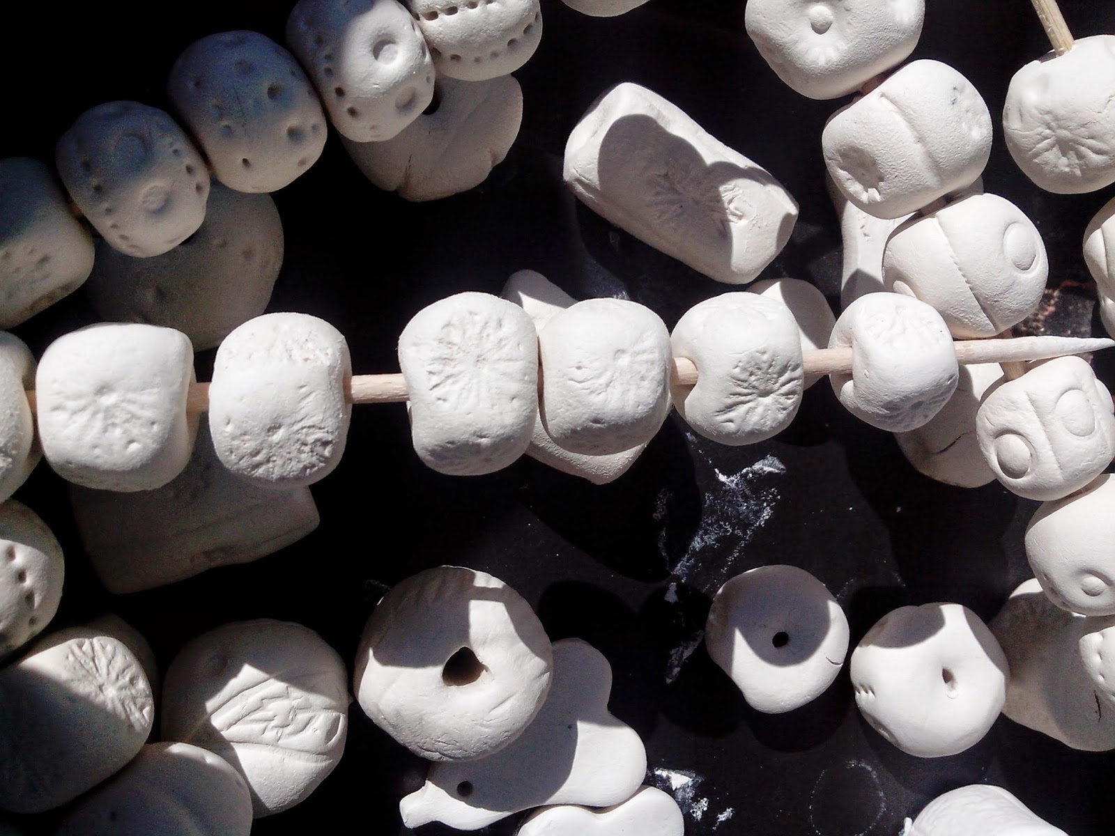 Bei schönem Wetter wird alles nach draussen verlagert. Hier habe ich neue Tonperlen gemacht. Mit lufttrocknender Masse. Die geformten Kugeln bekamen zwecks Schaschlikspieß ein Loch und wurden mit diversen Materialien bestempelt.