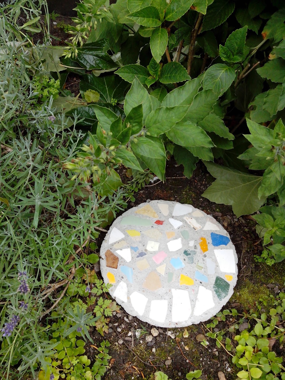 Ich wollte Trittsteine aus Beton für das Blumenbeet machen. Da ich eh noch Unmengen an Steinchen und alten Scherbenresten hatte, konnte ich diese gut mal verarbeiten. Gesagt getan, in den Baumarkt gefahren, den 30 kg Beutel in den Kofferraum gewuchtet, Mama angerufen: "Hast du Lust mit mir im Garten kreativ zu werden?", Schüsselchen, Eimer, Wasser bereitgestellt und es konnte losgehen.Falls ihr auch mal Lust habt mit Beton im Garten zu matschen...schaut mal im Netz...da gibt es jede Menge Anleitungen. Es waren meine ersten Versuche und mit den Trittsteinen bin ich ganz zufrieden. Ich habe Topfuntersetzer benutzt, den trockenen Beton konnte ich leicht aus der Form lösen.