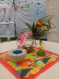 Da war doch was...Eine 0 habe ich bekommen...Zum Kaffee und Kuchen mit der Familie gab es eine Apfel-Deko. Die kleinen Äpfel fielen schon zu früh herunter. Essen konnte man sie noch nicht, aber für den Kompost waren sie auch zu schade. So bekamen sie noch genähte Blätter aus alten Handtüchern angeknotet...Da ich mal einmal eine große Party machen wollte (tja, wenn frau eine 0 bekommt...), tat ich mich mit meiner lieben Cousine zusammen. Sie besorgte Getränke & Co, ich war natürlich für die Deko zuständig. Ich war noch in Sommerlaune, so wollte ich ein bisschen HAWAI Feeling mit reinbringen. Die Stöffchen der Wimpelkette sind von "Hamburger Liebe".