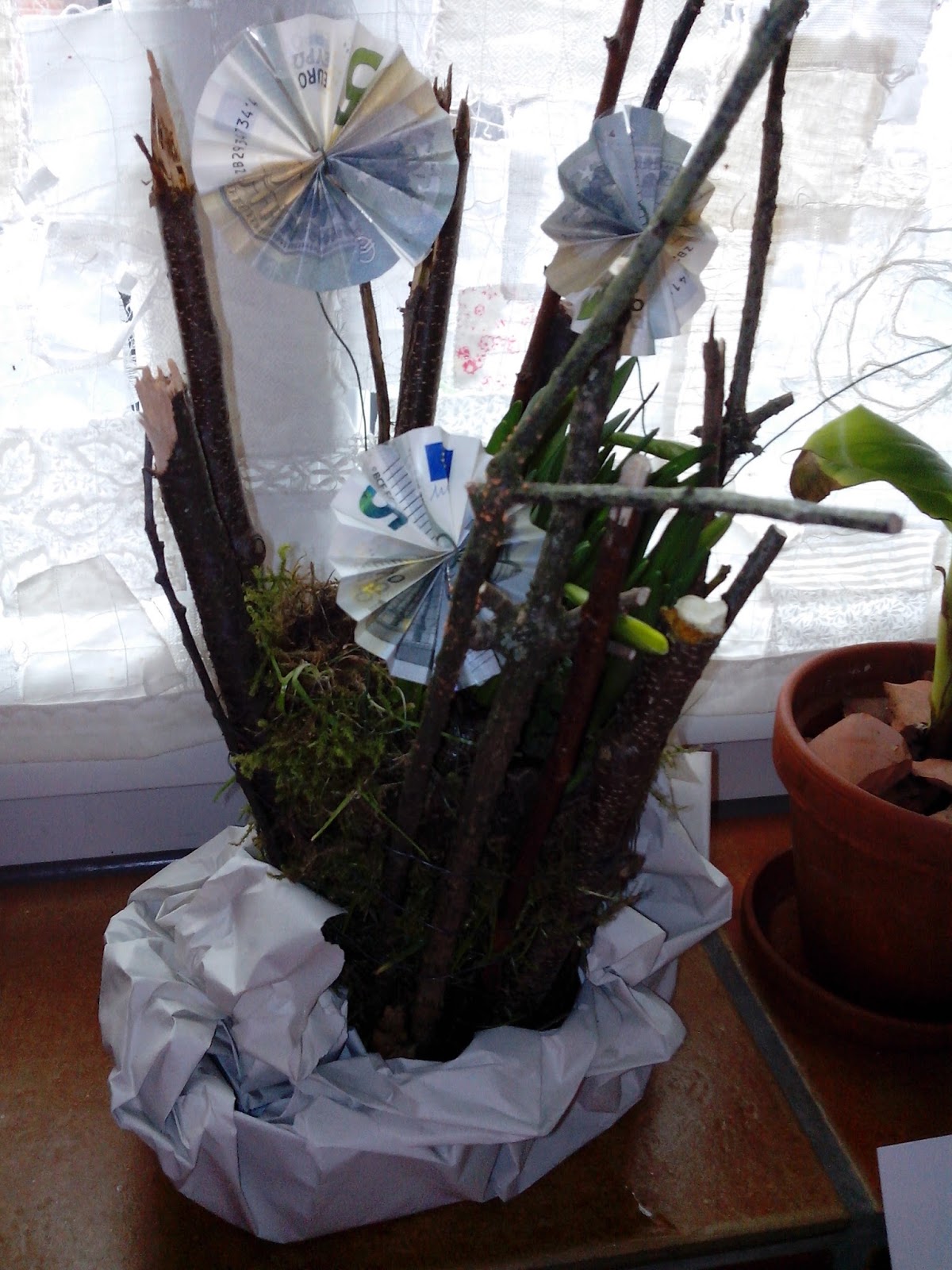 Mit altem bemoosten Gehölz habe ich letzte Woche auch ein schönes Geschenk für eine Freundin gebastelt. Gesehen hatte ich diese Ideen bei "Filz und Garten". Der Plastiktopf der Osterglocken wurde mit Moos aus dem Garten umlegt, mit Draht umwickelt und die gefundenen Hölzer ebenfalls mit Draht befestigt. Da es ein runder Geburtstag war und sich die Gastgeberin Geld gewünscht hat, habe ich 5,-€ Scheine zu kleinen Blumen gefalten und mit Draht in die Erde gesteckt.