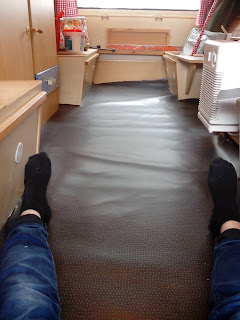 Es dauerte 3 Stunden bis der Kleber nicht mehr klebrig, aber elastisch war und ich den Bodenbelag wieder zurückrollen konnte. Ich gehe gleich mal gucken, ob auch alles gut gehaftet hat und keine Blasen oder so etwas geworfen hat...