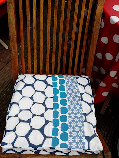 Die Stuhlkissen habe ich auch neu. Der blaue Stoff mit den 7-Ecken ist der Rest meiner Wohnwagen-Bettwäsche. Diese habe ich beim Möbelschweden in Holland gekauft. Da dort die Bettwäsche andere Größen haben, habe ich das was zu viel war einfach abgeschnitten und zugenäht. So hatte ich viele Reste für neue Stuhlkissen.!
